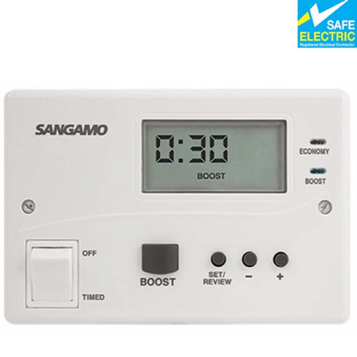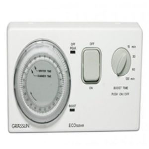 The timer is used to programme immersion heater circuit(s) (up to 3 kW – 13A 230v AC) and controls the main immersion element in your hot water cylinder on a 24 hour cycle so that you can programme your hot water to come on in the morning, evening, afternoon etc. The device controls single, dual or double immersion heater output loads and one of our fully trained technicians can advise you on what type of output you are likely to have. Unlike some other timers, the Ecosave has the added extra of a separate boost control which gives the user an optional 15, 30, 60 or 120 minute (self-resetting) heat output without affecting your pre-programmed timer sequence.